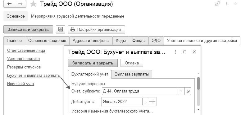 2. Аналогичным образом настроим отражение зарплаты сотрудников ООО "Трейд" на 44й счет по умолчанию для всей организации.