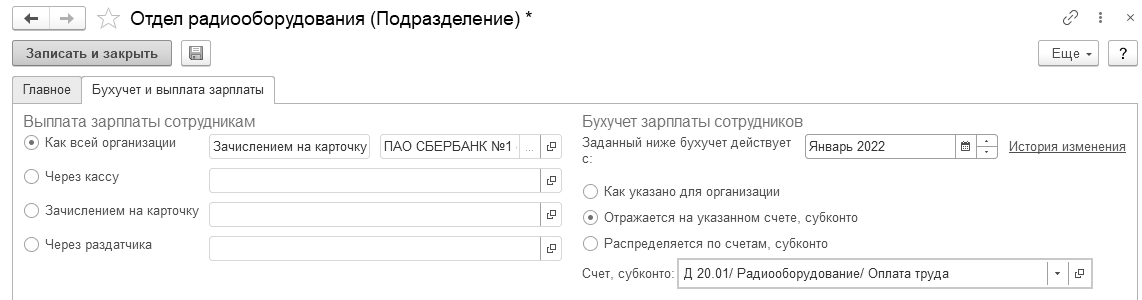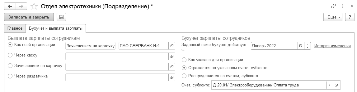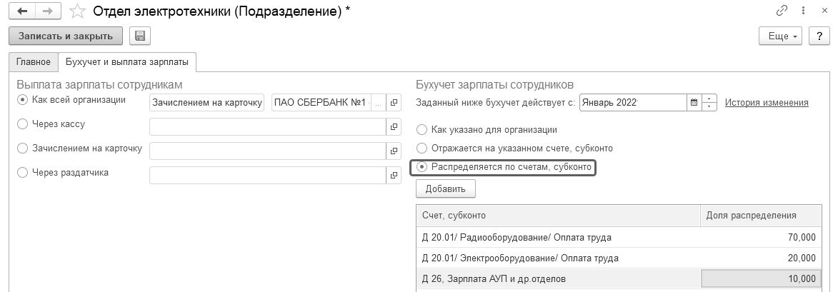 В карточке подразделения также возможно указать способ отражения зарплаты сотрудников данного подразделения в учете. Помимо этого, можно также указать, что суммы будут распределяться пропорционально.