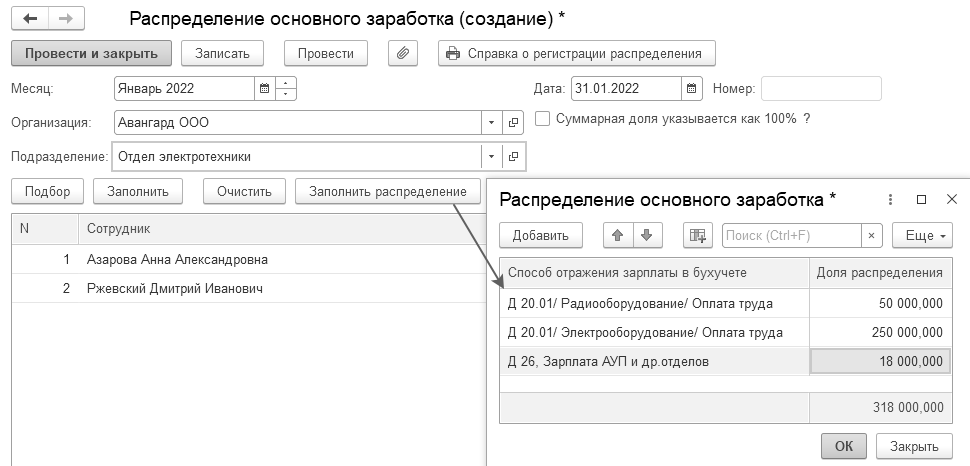 В табличной части документа выбираются способы отражения в учете и доля распределения. В качестве показателей распределения можно указывать любые значения, при необходимости можно установить флаг "Суммарная доля равна 100%" - в этом случае подразумевается, что пользователь вводит уже рассчитанные проценты для распределения. Распределение можно заполнить для всех сотрудников в документе.
