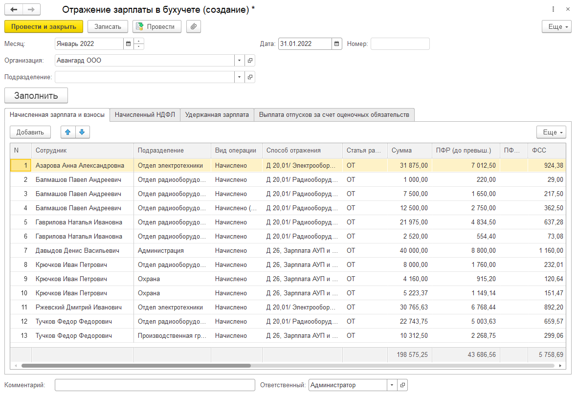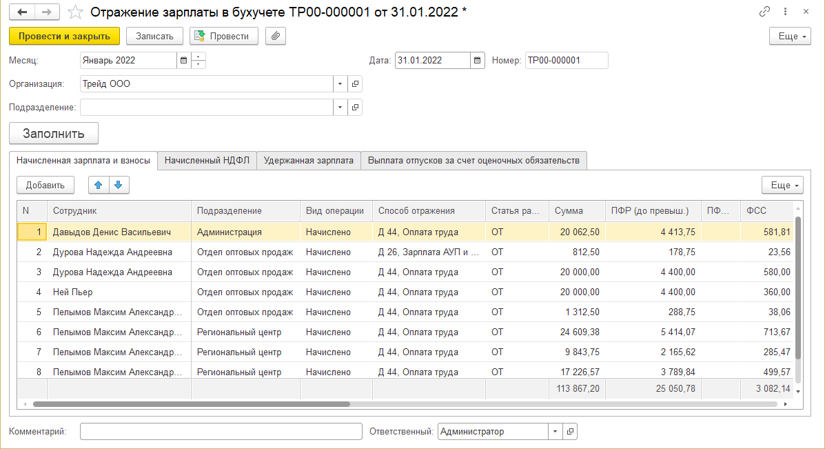 Начисленная зарплата и взносы – в соответствии с настроенными способами отражения в учете