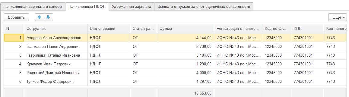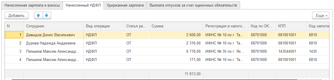 Проанализируем суммы удержаний НДФЛ по отчету "Бухучет". Налог по всем сотрудникам отражен по ИФНС г. Тамбова, кроме НДФЛ Пелымова М.А. за период его работы в региональном центре.