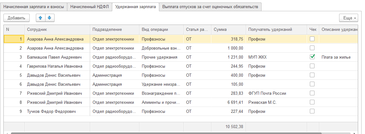 Напомним, что в документе для каждого сотрудника заполняется также подразделение – следовательно, подразделения будут передаваться в бухгалтерскую программу и данные справочники должны быть синхронизированы. Данные по выплате зарплаты не участвуют в формировании отражения в учете, т.к. документы по выплате передаются в бухгалтерскую программу отдельно.