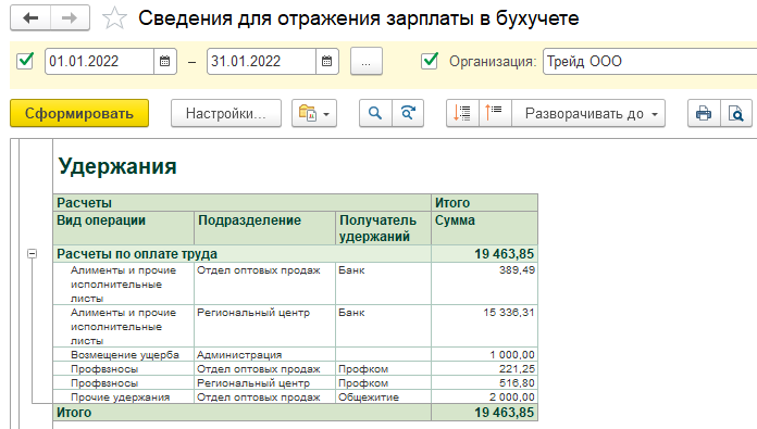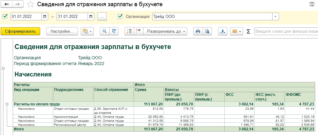 Откроем в разделе "Зарплата/ Отчеты по зарплате" отчет "Сведения для отражения зарплаты в бухучете". Сформируем по организации ООО "Трейд" за январь 2022г. Проанализируем отражения в учете начислений.