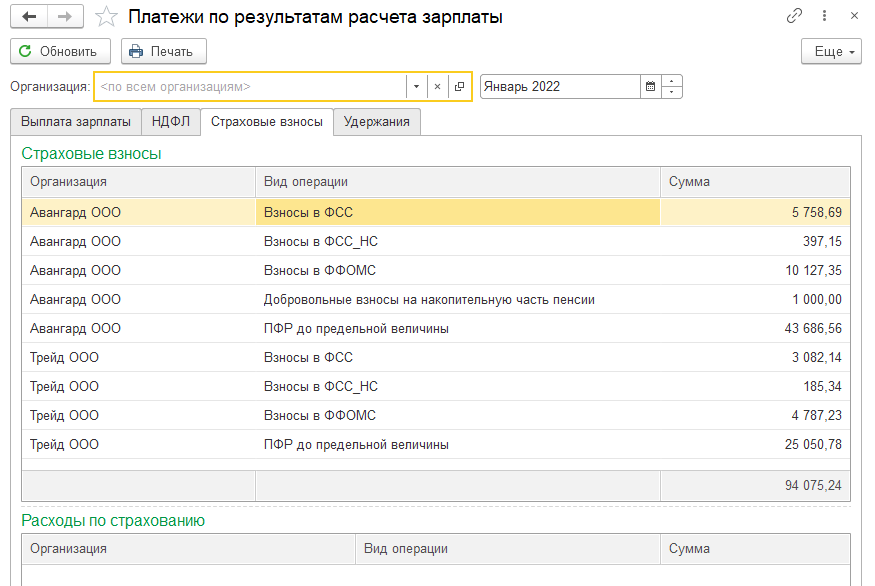Уплата страховых взносов производится и регистрируется в бухгалтерской программе. Так, ежемесячно в бухгалтерскую программу передаются сведения по отражению зарплаты в учете. В документе можно просмотреть сведения об общих начисленных суммах взносов. Также эту информацию можно просмотреть в отчете по бухучету (раздел "Зарплата/ Отчеты по зарплате"), либо в отчетах по налогам и взносам (например, "Проверка расчета взносов"). Также можно воспользоваться помощником "Платежи, перечисления" в разделе "Выплата".