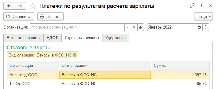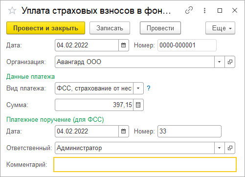 Уплата производилась 04.02. Зарегистрируем уплату в ФСС документами из раздела "Налоги и взносы/ Уплата страховых взносов в фонды": сумма 397,15 руб., реквизиты п/п № 33 от 04.02.2022.