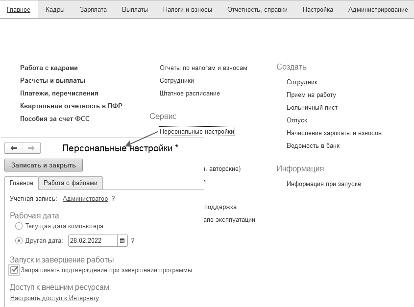 Крайне важно следить за правильностью выбора месяца начисления в документах! Для тех слушателей, кому сложно отслеживать в рамках курса месяц начисления при выполнении заданий, можно установить рабочую дату. Для этого в разделе "Главное/ Персональные настройки" следует указать 28.02.2022.