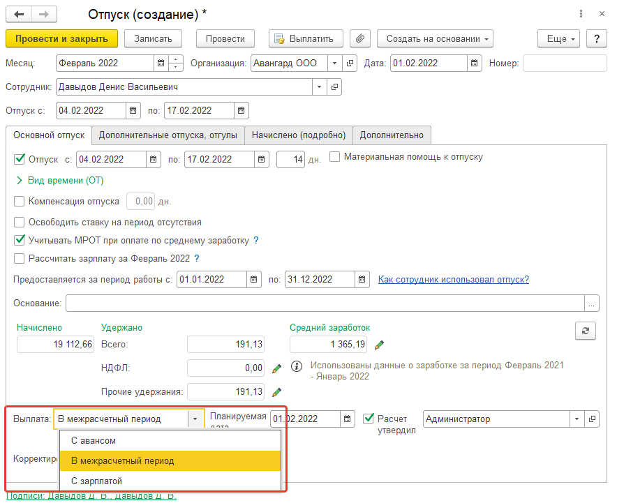 Следует также обратить внимание на выплату межрасчетных документов. Суммы, рассчитанные в них, могут выплачиваться в межрасчетный период, т.е. отдельно от основной зарплаты, с авансом или при окончательной выплате зарплаты за месяц.