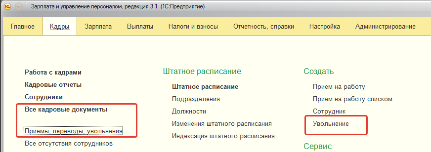 Документы вызываются из раздела "Кадры / Приемы, переводы, увольнения", либо "Кадры / Все кадровые документы", либо "Зарплата / Все начисления".