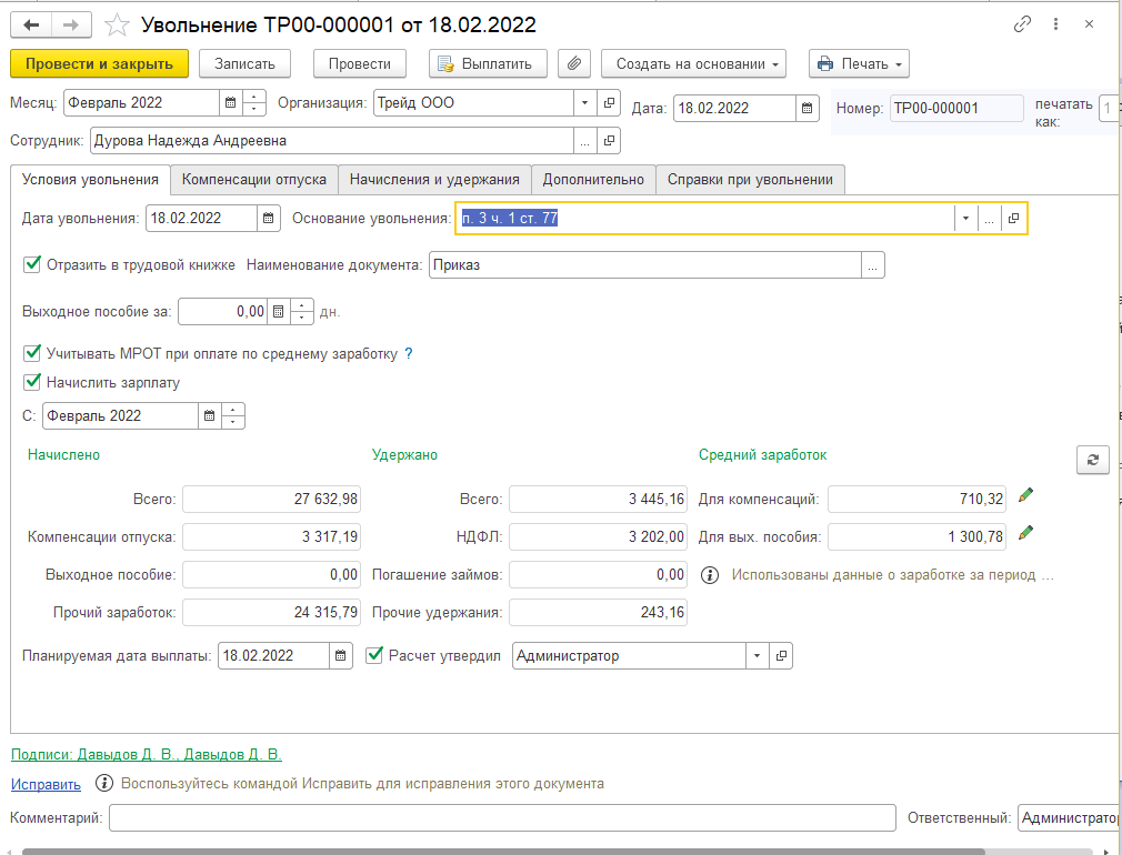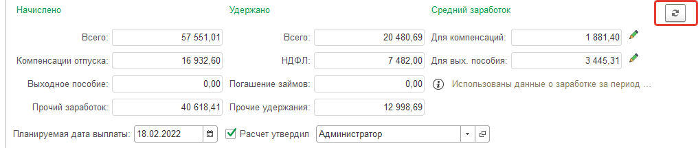 Расчет компенсаций при увольнении, выходного пособия, а также фактической заработной платы производится непосредственно в этом документе автоматически. При необходимости суммы можно пересчитать по соответствующей команде.