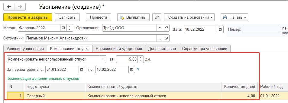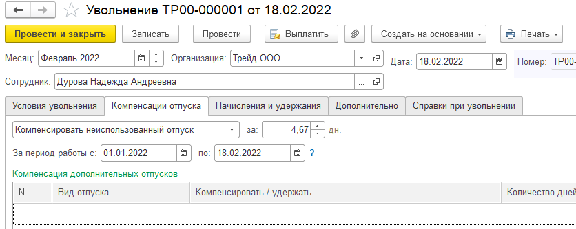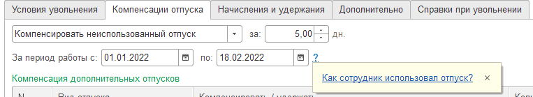 В соответствии с датой увольнения сотруднику автоматически рассчитывается компенсация (либо удержание) отпуска за его рабочий период. При необходимости можно также ввести компенсации дополнительных отпусков (каждого вида отдельно).