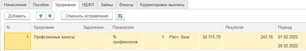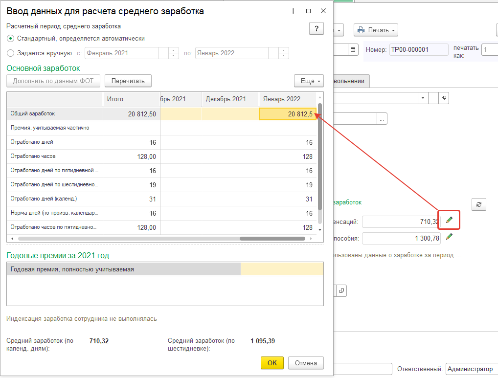 Ручные правки прошлых периодов до ведения учета в этой базе будут сохраняться, если потребуется создать другой документ, но так как данные по сотруднику в учебной базе могут быть учтены только за январь, то заработок не требует редактирования.