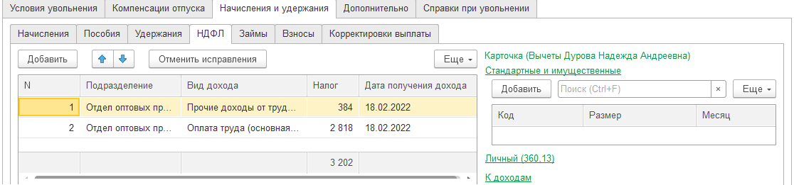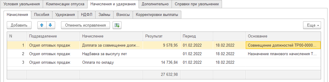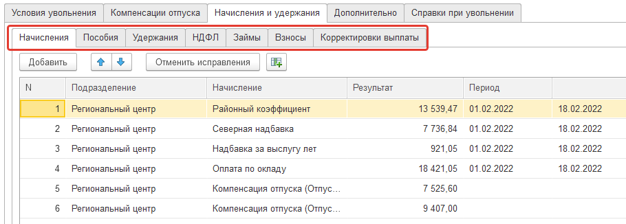 Это такие же закладки, как в документе "Начисление зарплаты и взносов". Таким образом, для увольняющегося сотрудника данный документ заменяет начисление зарплаты в полном объеме.