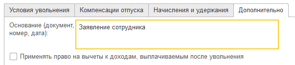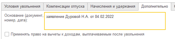 На закладке "Дополнительно" указывается информация для вывода приказов на печать. При необходимости можно указать флаг "Применять право на вычеты к доходам, выплачиваемым после увольнения".