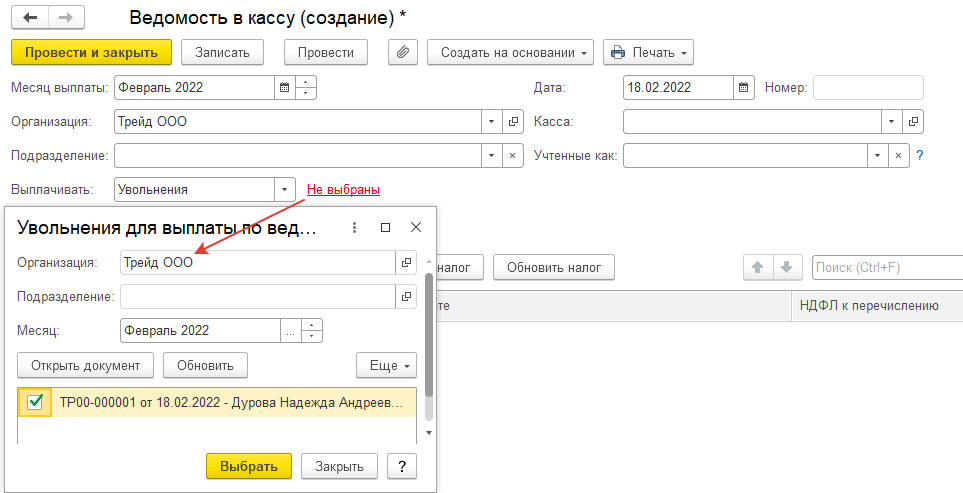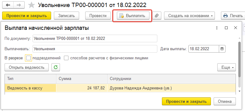 Проведем и закроем документ. Выплатим заработную плату данному сотруднику через кассу ("Выплаты/ Все ведомости на выплату"), в качестве способа выплаты выберем вариант "Увольнения" и ссылку на приказ об увольнении.