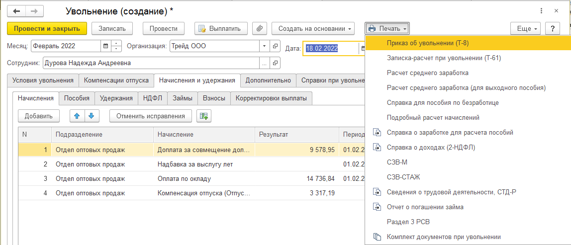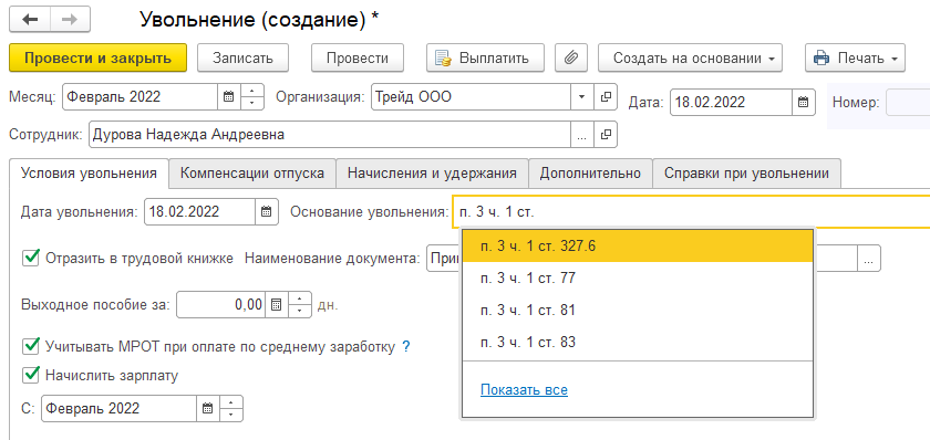Уволим из ООО "Трейд" сотрудницы Дуровой Н.А. 18.02.2022 и рассчитаем все причитающиеся ему суммы. Для этого перейдем в разделе "Зарплата / Все начисления" к списку документом и добавим документ "Увольнение". Дата документа и дата увольнения – 18.02.2022, месяц – февраль 2022г., суммы будут рассчитаны автоматически.