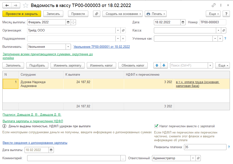 В данной ситуации в организации принято решение перечислить НДФЛ сразу. Уточним реквизиты уплаты НДФЛ: № 35 и проведем ведомость в кассу.