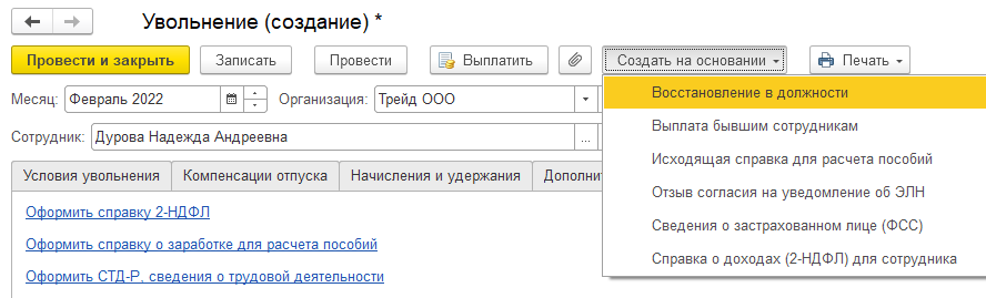 При этом из формы документа "Увольнение" выводится приказ по форме Т-8, из формы документа "Увольнение списком" - по форме Т-8а. На основании документа можно ввести справки, выдаваемые при увольнении, а также другие документы.