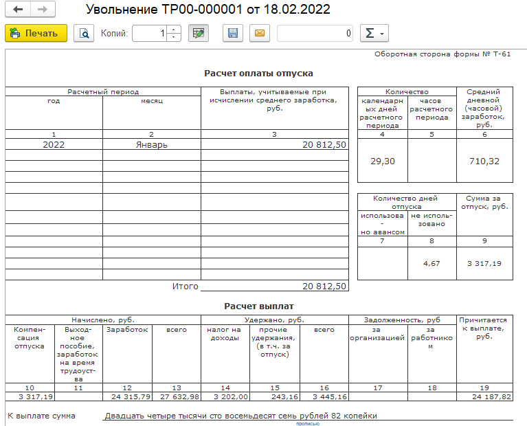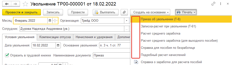 Без формирования документов в программе, можно вывести на печать (помимо приказа по форме Т-8 и записки-расчета по форме Т-61) из формы документа-увольнения:
