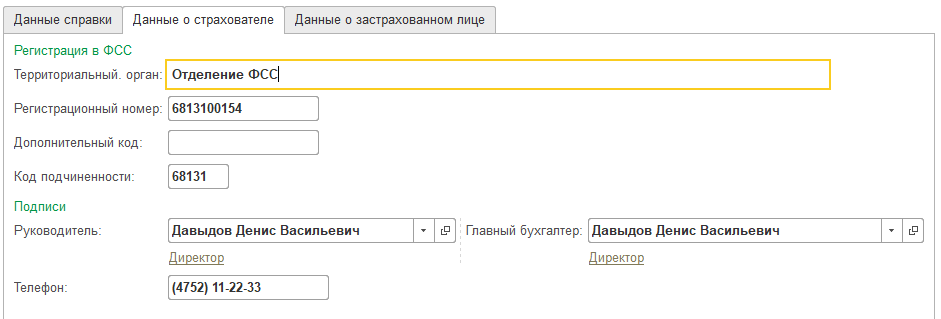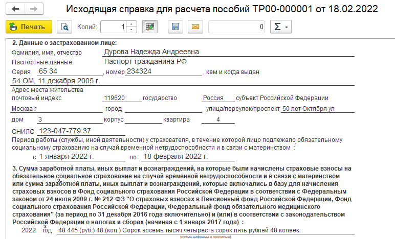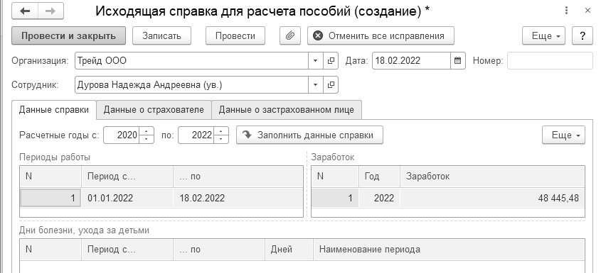 При создании документа указывается: дата документа, сотрудник, которому выдается справка; расчетные годы, за которые необходимо предоставить сведения о заработке. Данные в справке заполняются автоматически и при необходимости могут быть откорректированы вручную.