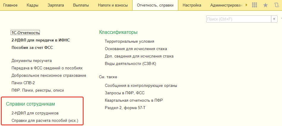 Рассмотренные выше справки для выдачи сотрудникам на руки можно также сформировать в разделе "Отчётность, справки".