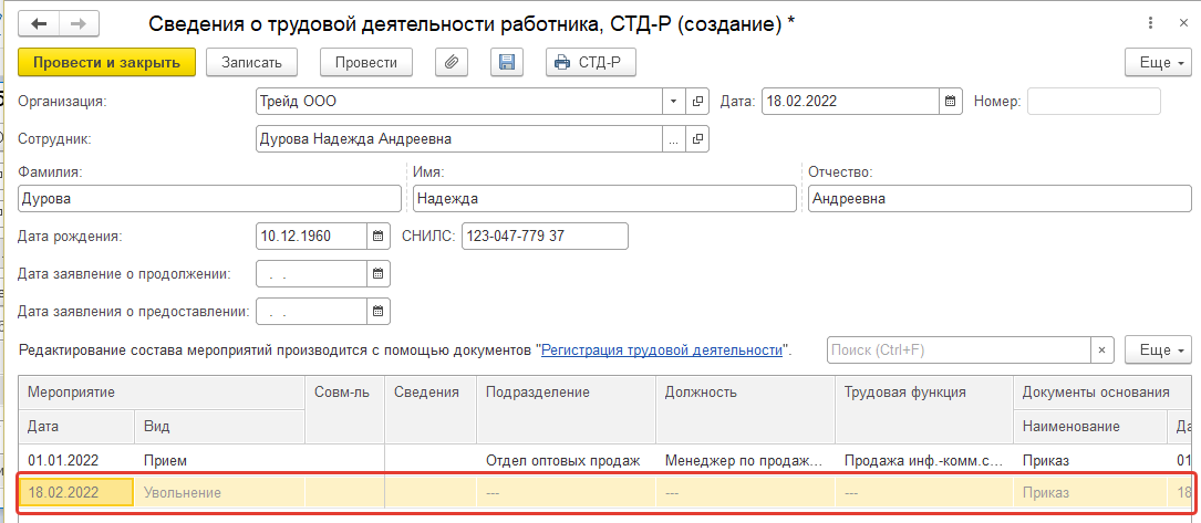 Если СТД-Р формировать до того, как сформирована СЗВ-ТД, то запись об увольнении в документ в любом случае будет добавлена, но выделена бледным шрифтом, как не "переданная" в ПФР.