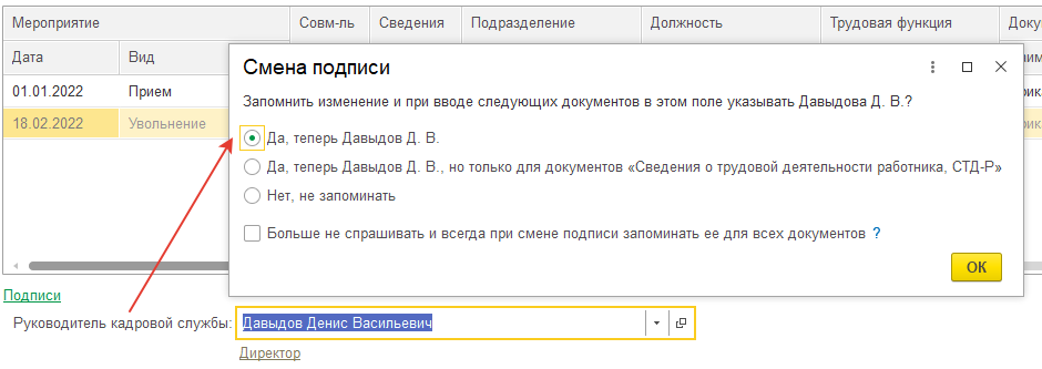 Укажем подписанта – руководителя кадровой службы (его обязанности исполняет Давыдов).