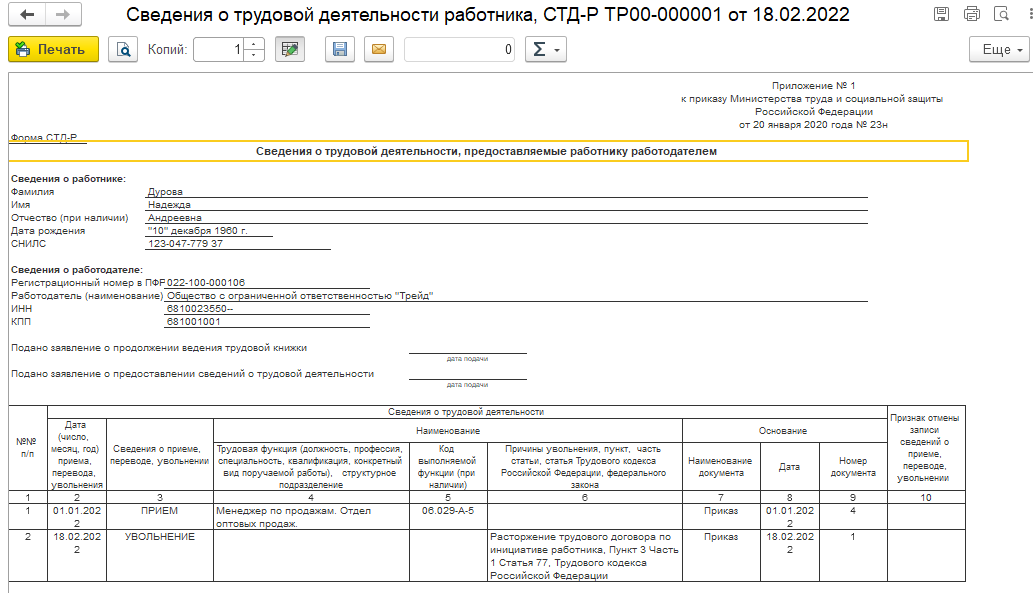 При формировании документов автоматически заполняются данные сотрудника, записи о его трудовой деятельности в организации.