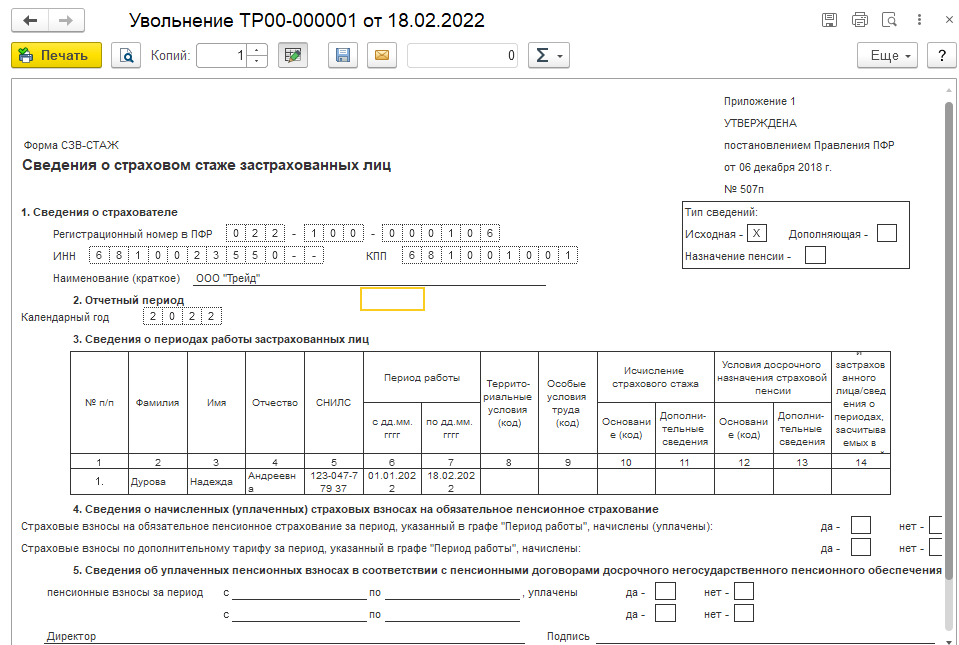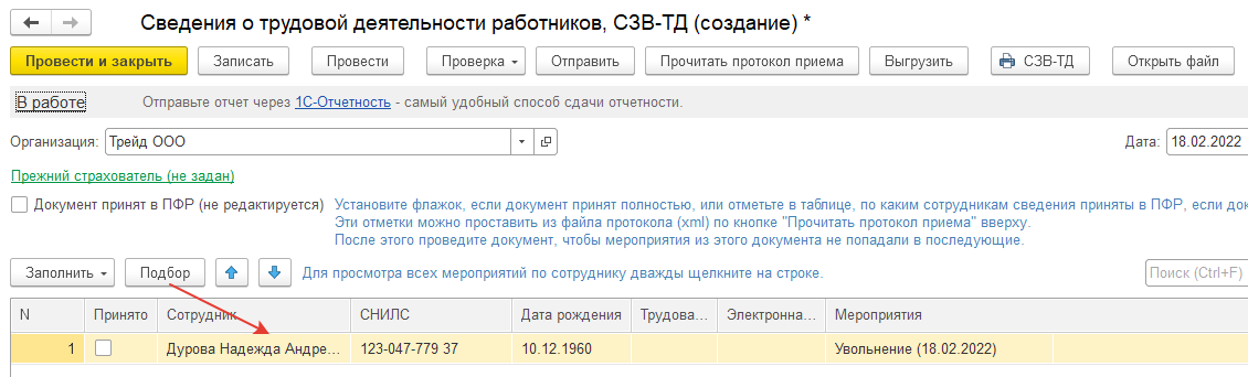 Установим отметку о приеме в ПФР и проведем документ. Проведем документ.