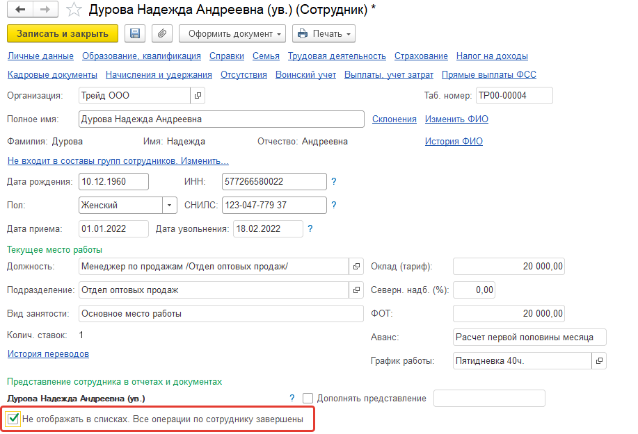 Скроем данные сотрудника в архив. Для этого откроем в разделе "Кадры" справочник "Сотрудники". Откроем карточку сотрудницы Дуровой Н.А. и установим флаг "Не отображать в списках". Запишем и закроем данные сотрудника.