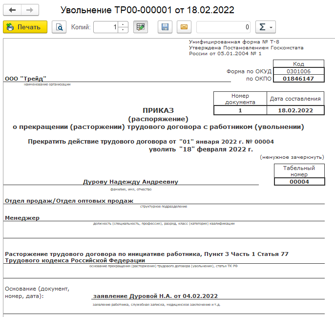 Из формы приказа по увольнению Дуровой Н.А. выведем на печать формы, которые не потребуют создания документов в программе (без значка документа):