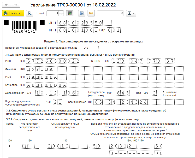 · Раздел 3 формы РВС на увольняемого сотрудника;