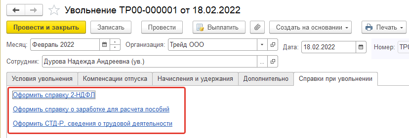 На основании приказа об увольнении можно ввести следующие справки: 2-НДФЛ для выдачи на руки, Справка для расчета пособий.