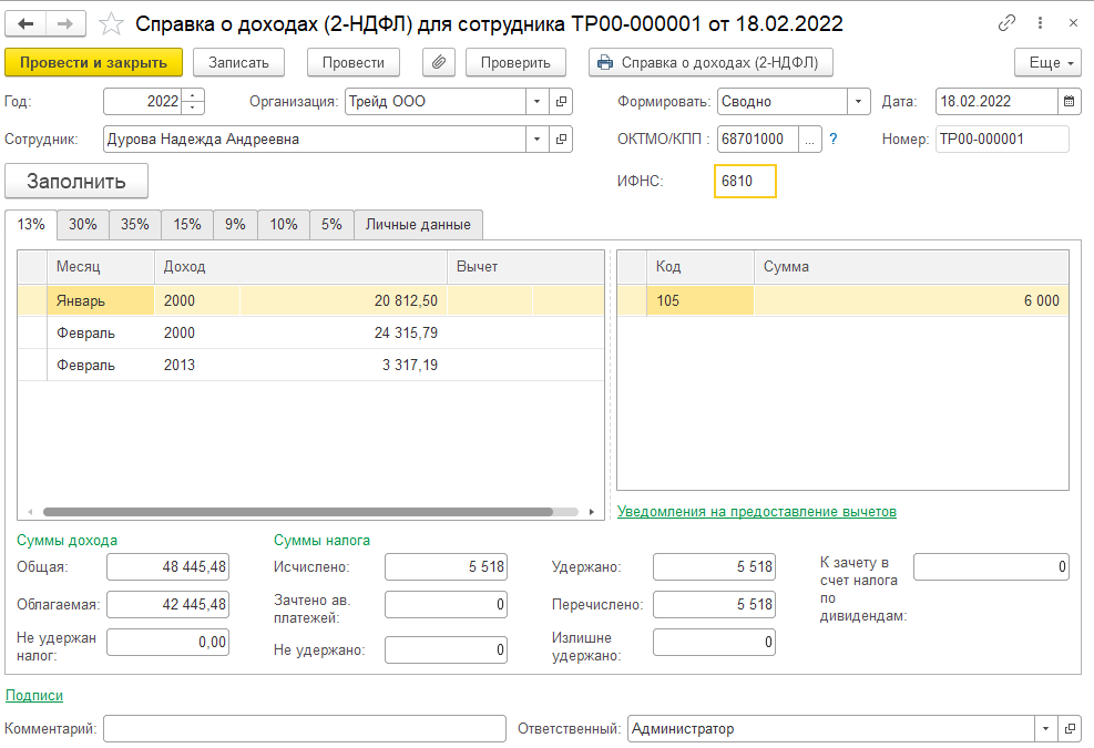Документ заполняется автоматически при выборе сотрудника. В документе добавлена возможность просмотра сведений о доходах и суммах налога по конкретной справке, а также просмотра и корректировки личных данных физлица.