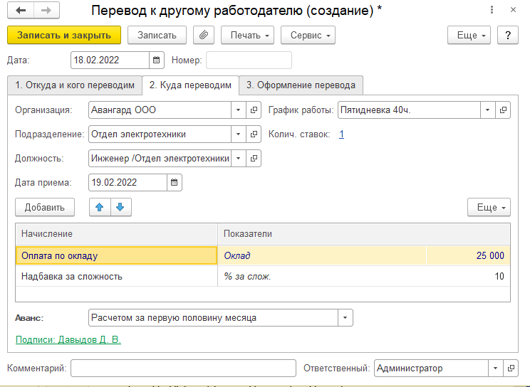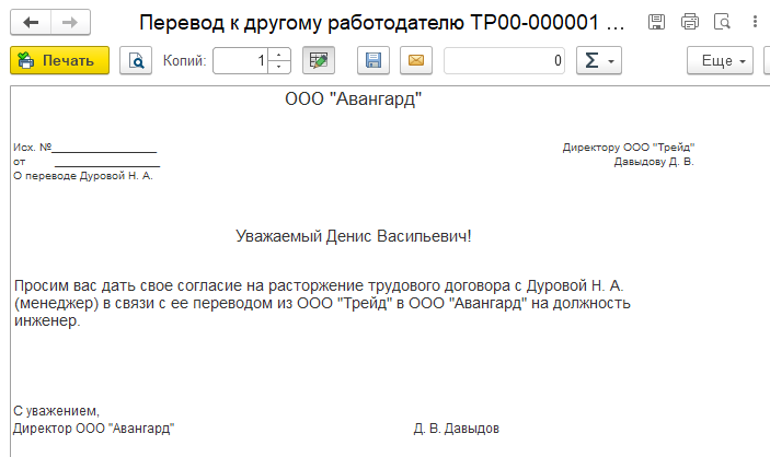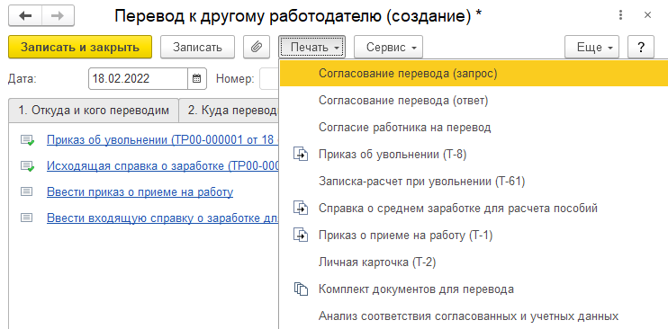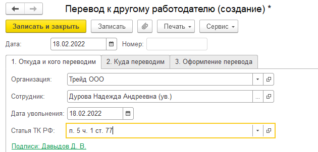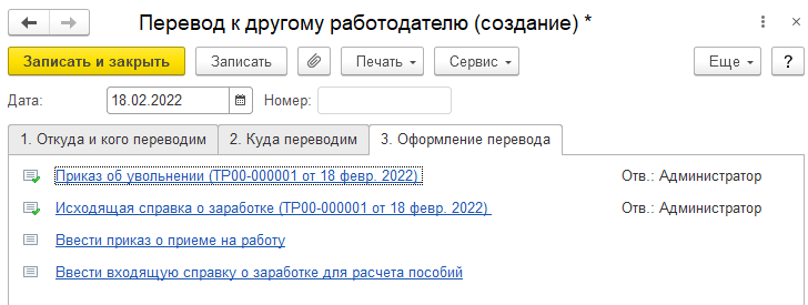 Документ "Перевод к другому работодателю" сам не делает никаких кадровых движений в программе. Он является рабочим местом по оформлению пакета документов, связанных с увольнением сотрудника переводом в другую организацию, учет по которой ведется в этой же информационной базе (т.е. перевод в рамках холдинга между юридическими лицами).