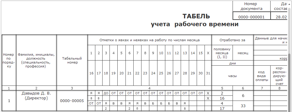Таким образом, для учета рабочего времени по методу отклонений табель учета рабочего времени формируется в программе как отчет для печати.