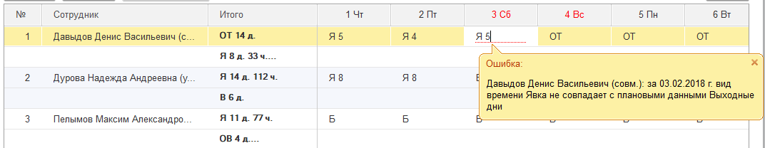 Следует также обратить внимание, что при попытке указать в табеле сотруднику рабочее время в выходной по графику, при проведении документа будет выдано сообщение об ошибке.