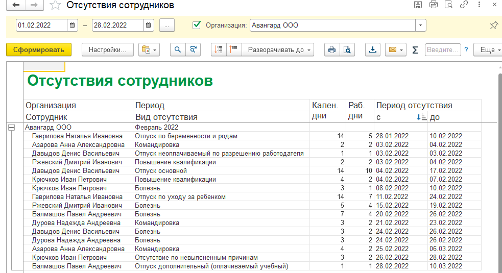 Отчет "Отсутствия сотрудников" – в отчете выводится список отсутствий с сотрудников за заданный период с указанием причин и дат отсутствия;