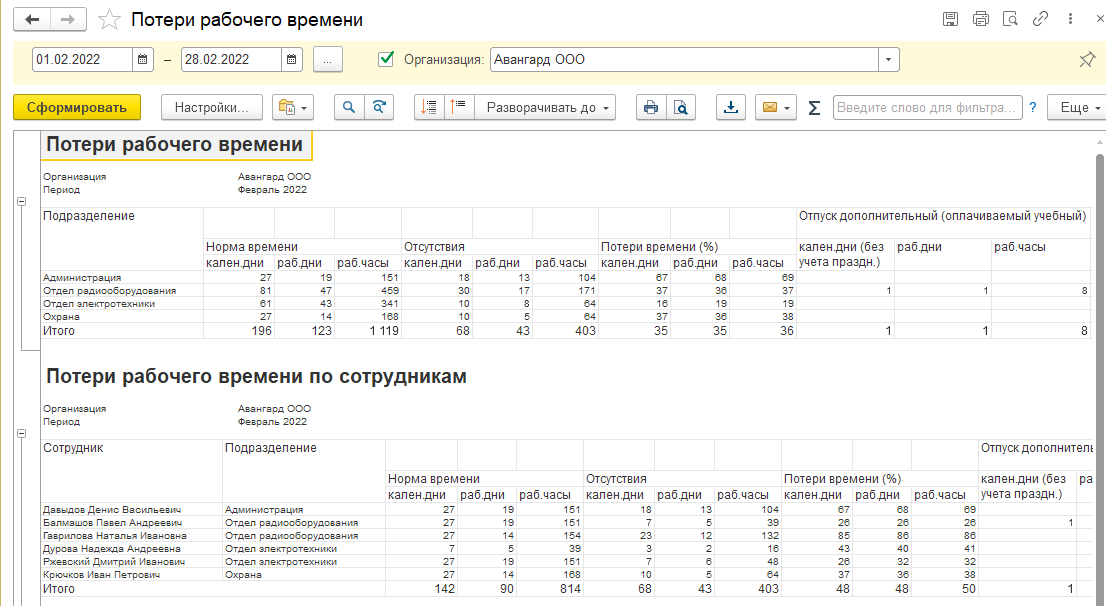 Отчет "Потери рабочего времени" – отчет позволяет проанализировать по подразделениям и по сотрудникам фактически отработанное время по сравнению с нормой, вывести коэффициент временных потерь и проанализировать причины отсутствий.