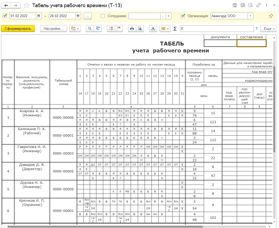 Откроем раздел "Зарплата/ Отчеты по зарплате" и выведем отчет "Табель учета рабочего времени (Т-13)" для ООО "Авангард" за февраль 2022г.