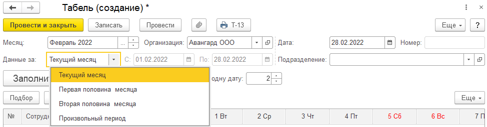 В документе указывается месяц ввода табеля и период составления табеля – целиком за указанный месяц, за первую и вторую половины указанного месяца по отдельности, произвольный период (например, если табель формируется каждую неделю).