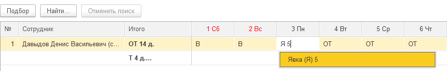 На одного сотрудника в данном документе можно ввести несколько отдельных строк с разными видами времени. Условные обозначения учета использования рабочего времени указаны в справочнике "Виды рабочего времени" (см. раздел по графикам работы).