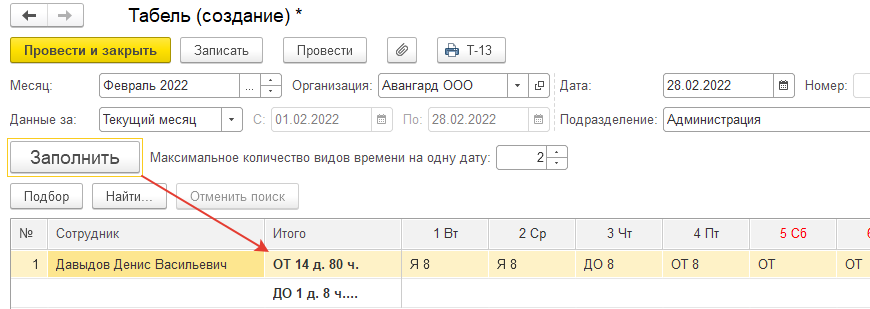 Введем табель учета рабочего времени за февраль по некоторым сотрудникам ООО "Трейд". Для этого откроем из раздела "Зарплата/ Табели" список документов и добавим новый документ-табель для ООО "Трейд" за февраль 2022г. для подразделения "Администрация". Добавим в документ сотрудника Давыдова Д.В. (если в документе выбрано подразделение, то можно нажать кнопку "Заполнить").