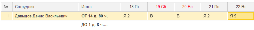 При необходимости на любую дату в табеле можно выполнить корректировку, уточнив (назначив) количество часов отработанного времени. При этом корректируются как часы за основное рабочее время, так и часы по другим видам времени. Буквы и цифры вводятся через пробел (Я 5).