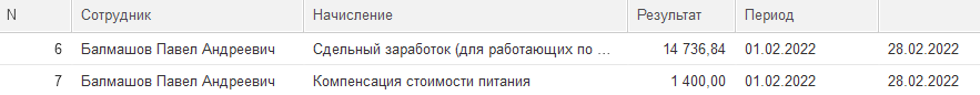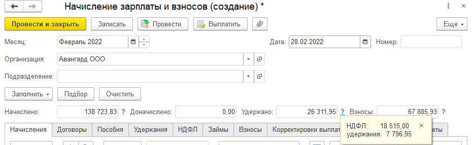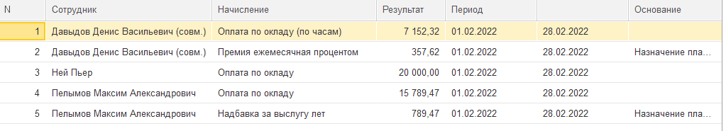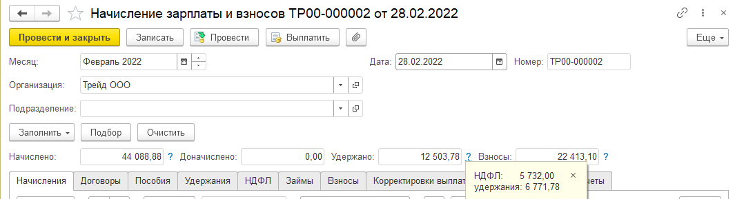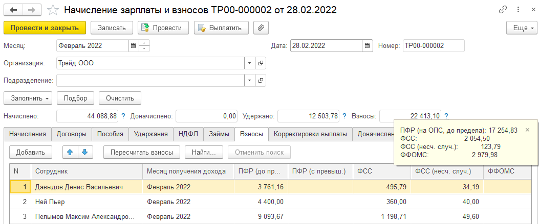 2. Начислим зарплату за февраль сотрудникам ООО "Трейд" (можно перезаполнить предварительный документ начисления зарплаты)