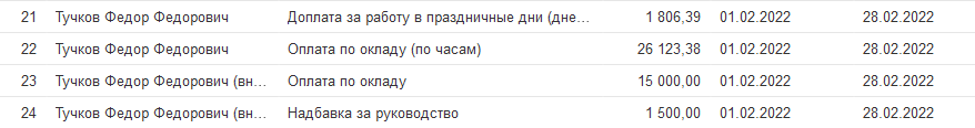 1.1 Проанализируем полученный результат на закладке "Начисления", расположив сотрудников в алфавитном порядке (либо воспользоваться дополнительными настройками документа – см. описание документа в расчете за первый месяц).