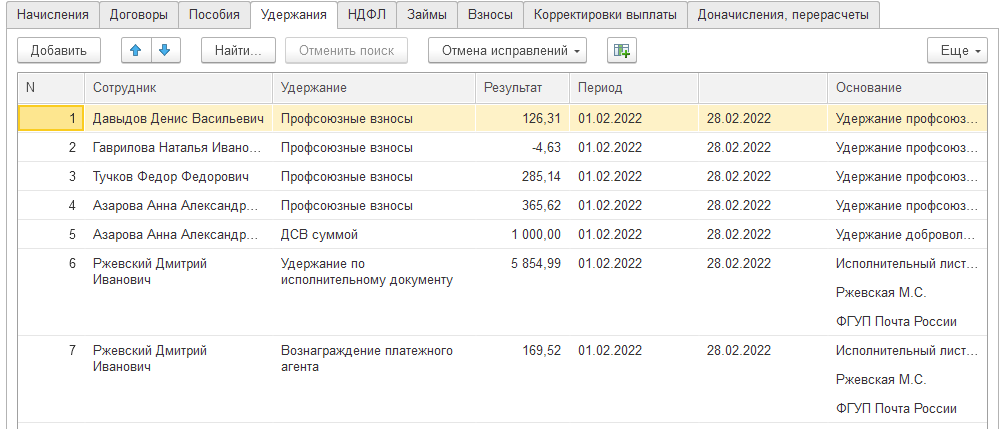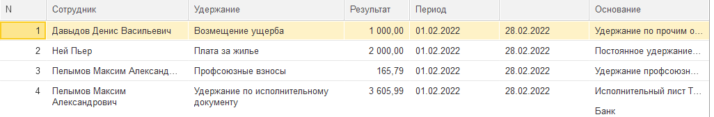 Также просмотрим отчеты по удержаниям сотрудников, убедимся, что ограничения взысканий не требуется.