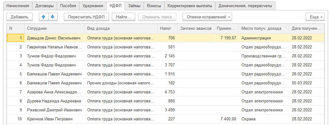 Д) По сотруднице Гавриловой получился отрицательный налог при расчете больничного листа. Сейчас часть налога будет зачтена – зачет отражается на закладке "Корректировка выплаты" (см. описание далее). Проведем документ.