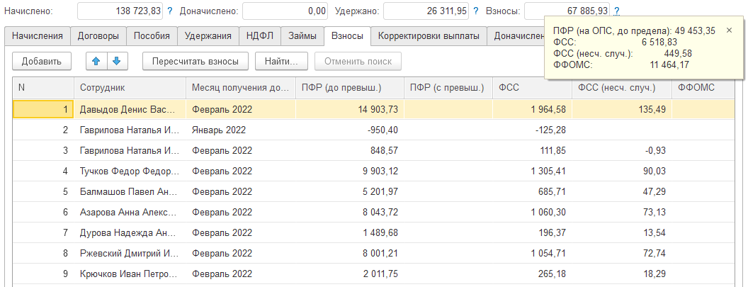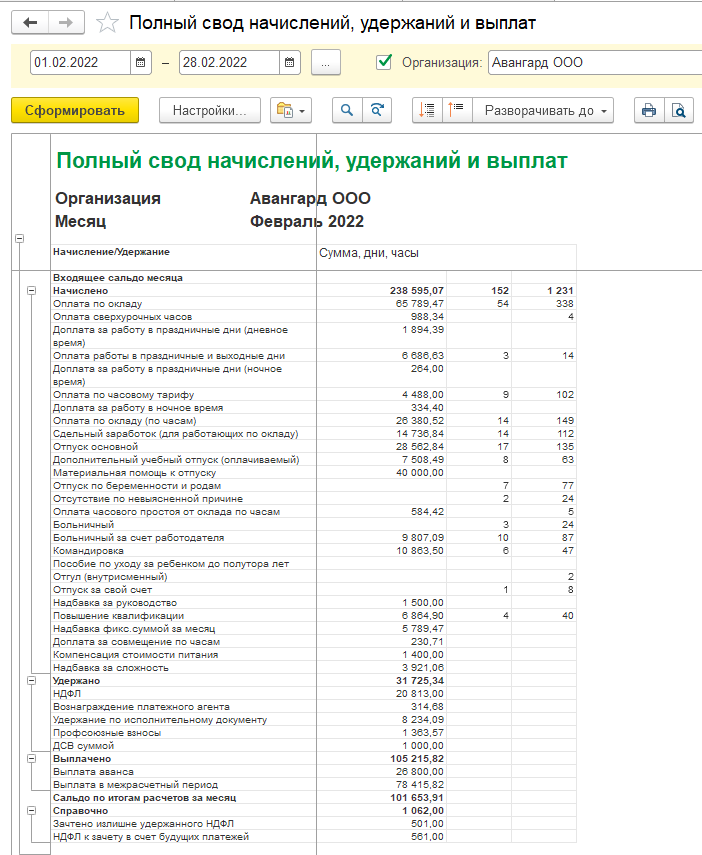 1.3. Обратите внимание на то, что суммы отпускных, среднего заработка и т.п. в документ "Начисление зарплаты и взносов" попадать не будут – они рассчитаны и записаны в регистры расчета по отдельным документам. Увидеть общий итог зарплаты за месяц можно в отчетах: расчетный лист, свод и т.п.