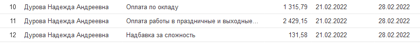 - смены, пришедшиеся на праздники, составляют 1дн. 11 ч., оплачиваются исходя из ставки 27 000 руб. Среднемесячное число часов за год по производственному календарю = 1973 часов/12 месяцев = 164,4166666667ч. Таким образом, Доплата за праздники (в соответствии с настройками расчета зарплаты) =оклад/среднемесячное число часов*время работы в праздники = =27 000 / 164,4166666667*11 = 1 806,39 руб.