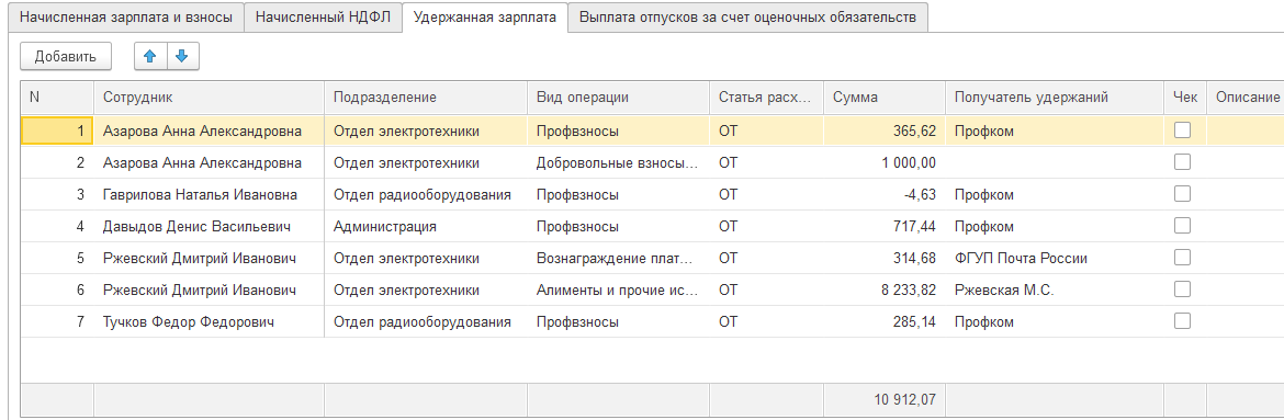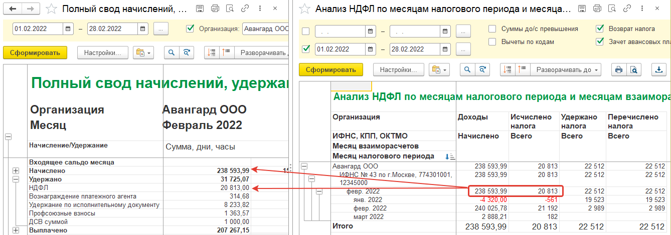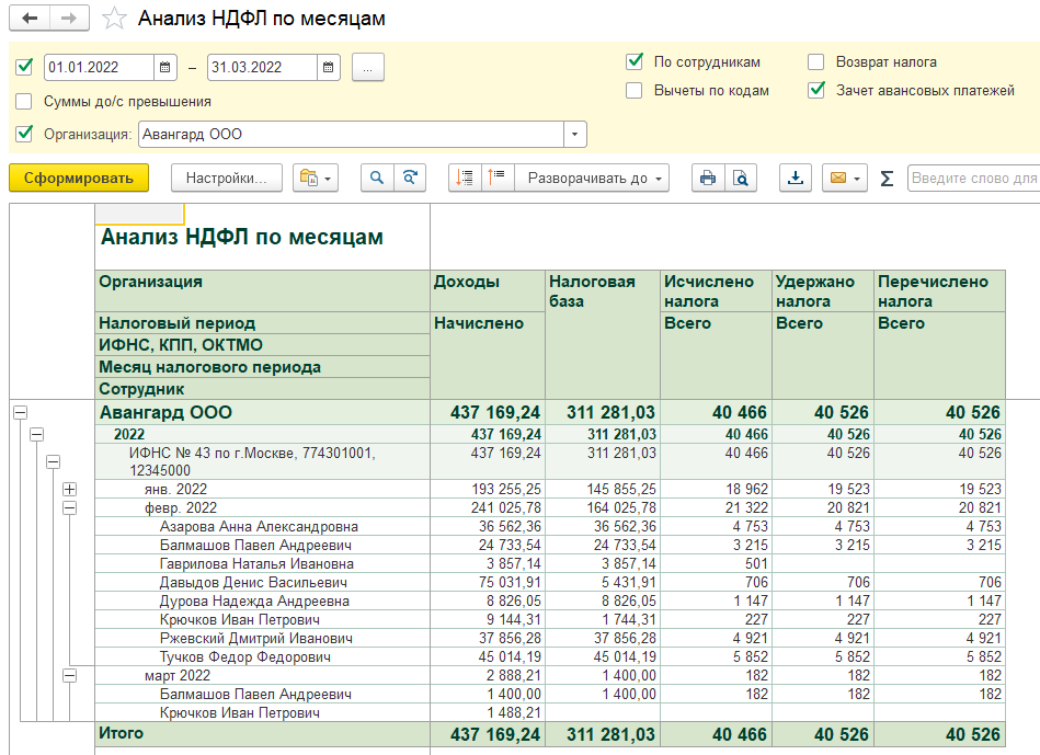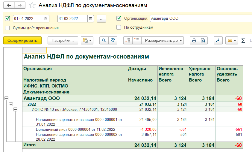Как мы видим из отчета, остается разница в 60 руб. (это излишне удержанный налог по Гавриловой, который будет зачитываться в последующих месяцах). Также проверяем по отчетам, что все доходы выплачены. Налог удержанный будет больше. Весь удержанный налог должен быть перечислен.